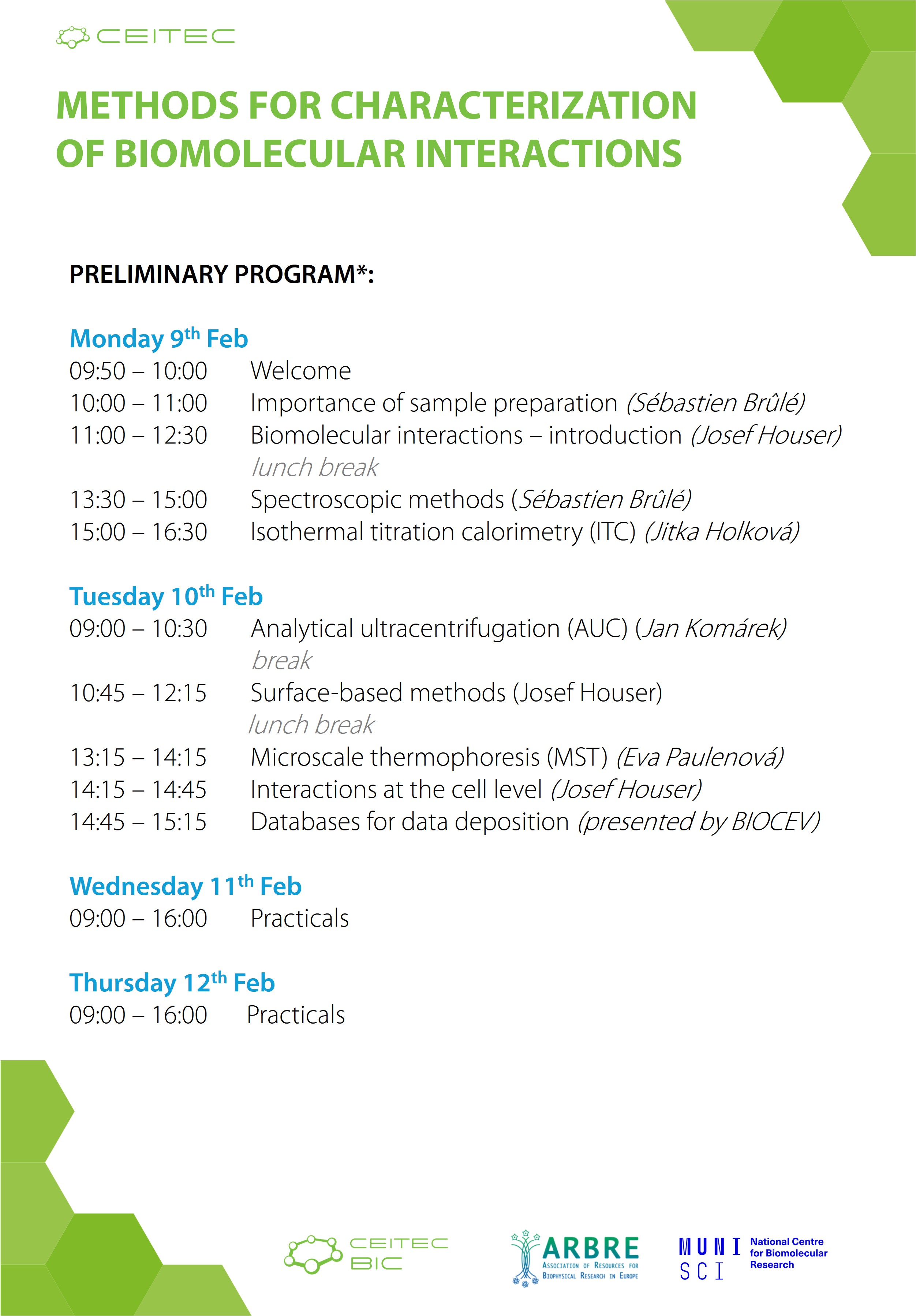 The CF Biomolecular Interactions and Crystallography, with support from the ARBRE association and National Centre for Biomolecular Research of MU, would like to invite you to a workshop focused on the characterization of biomolecular interactions. The workshop is intended for structural biologists, biochemists, and all others who wish to improve their knowledge of current methods for studying interactions between biomacromolecules and their ligands, including proteins, nucleic acids, and small molecules.