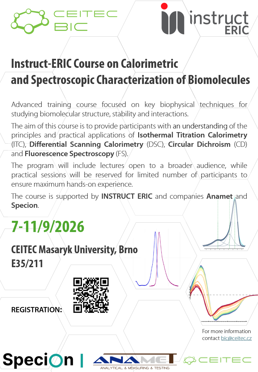 The CF Biomolecular Interactions and Crystallography, with support from Anamet and Specion would like to invite you to a workshop focused on characterization of biomolecules organized from September 7th to 11th 2026, in Brno at CEITEC MU (Central European Institute of Technology)